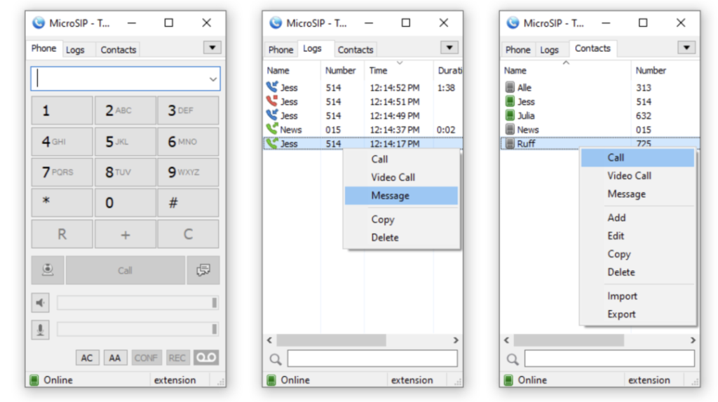 MicroSIP提供了一些基本的通话功能,包括呼叫、接听、挂断、保持通话、静音等。它支持音频编解码器(如G.711、G.722、Speex等)和各种网络协议(如UDP、TCP、TLS)。