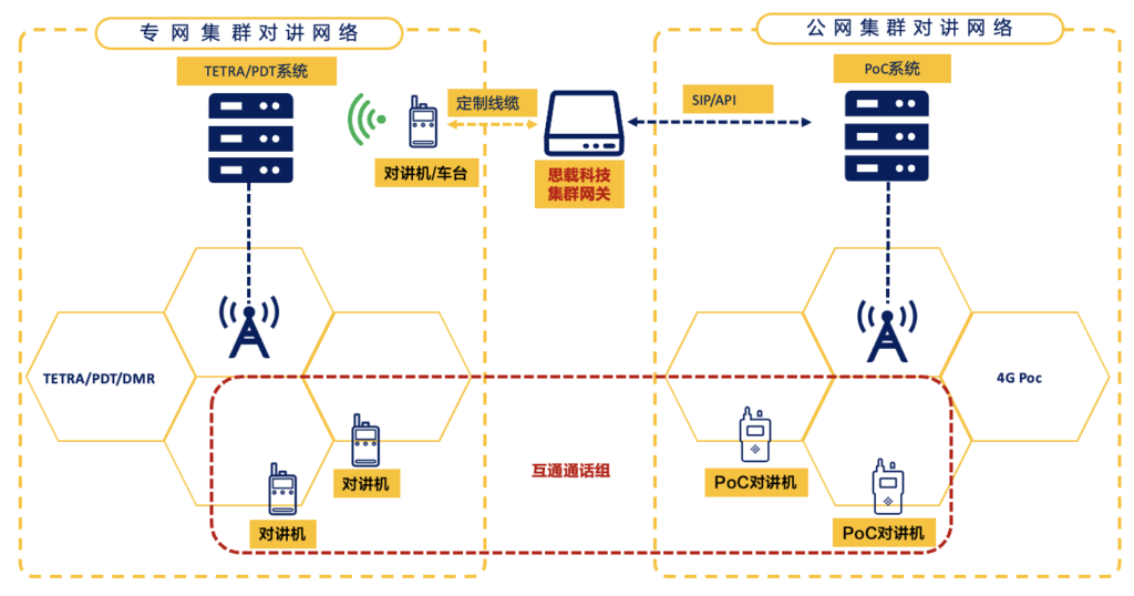 部署集群对讲网关,与现有无线集群对讲系统通过集群对讲网关连接,实现现有集群对讲频道与公网对讲机的通话组互通,公网对讲机可以有效的成为窄带集群对讲的互补。同时两系统也可以独立运行,互不干扰,免除协议系统级对接带来的技术和商务风险。