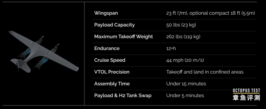 其官方公布上数据显示,起飞载荷约50磅,约23公斤左右。这一要求符合美国军方的采购要求,也意味着其发布的这款无人机也适应于美国市场。